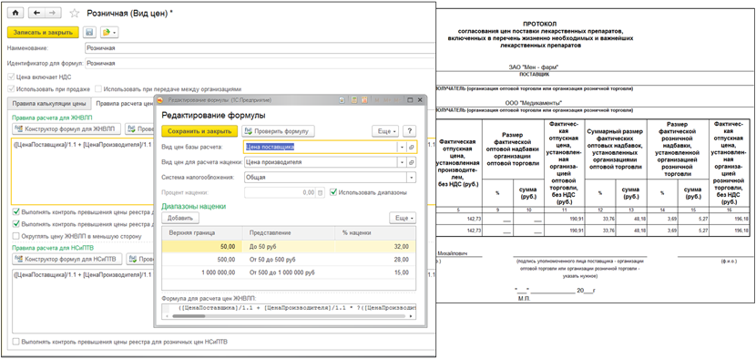 В конфигурации "Аптека" осуществляется контроль предельных розничных цен и цен производителей на лекарственные средства с учетом специфики ценообразования на препараты ЖНВЛП и НСиПТВ. Предусмотрена загрузка реестра предельных цен производителей лекарственных средств с диска или онлайн-версии ИТС МЕДИЦИНА, и автоматический расчет предельной розничной цены на основании уже загруженного реестра предельных цен производителей.