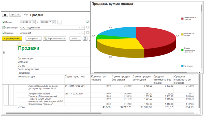 В "1С:Аптека" формируется более 30 видов аналитических отчетов с разным уровнем группировки и детальными расшифровками по всем видам операций. Представлены абсолютные значения показателей за период, средние значения, динамика показателей с течением времени и относительные показатели эффективности торговых операций. Особое внимание уделено анализу продаж, как в разрезе товарных групп, так и групп покупателей, оценке эффективности применяемых скидок, распродаж.