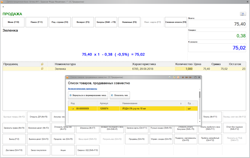 Решение "1С:Аптека" предоставляет пользователю специализированный интерфейс рабочего места первостольника для оформления розничных продаж. Для повышения эффективности продаж сопутствующих товаров реализован механизм учета товаров, продаваемых совместно. Данный механизм позволяет в ручном или автоматическом режиме подобрать список товаров продаваемых совместно. Для автоматического режима заполнения совместных товаров используется механизм поиска ассоциаций.