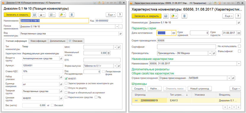 В конфигурации "Аптека" ведется учет по сериям для лекарственных средств. Серийный учет лекарственных средств реализован на базе механизма дополнительных характеристик. Решение позволяет вести учет жизненно необходимых и важных лекарственных средств (ЖНВЛП), обязательного аптечного ассортимента и специализированных групп, учет аналогов лекарственных средств, позволяющий найти замену отсутствующему лекарственному средству или товару.