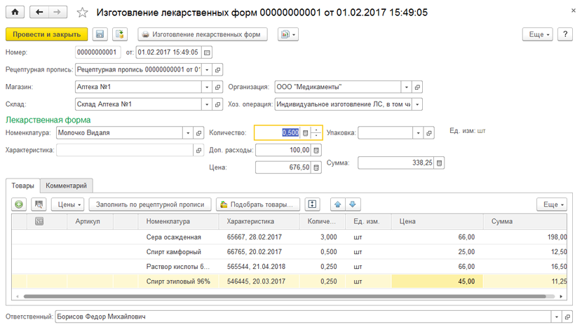 В конфигурации "Аптека" реализован учет производства лекарственных форм при помощи документа "Изготовление лекарственных форм", в котором указываются: