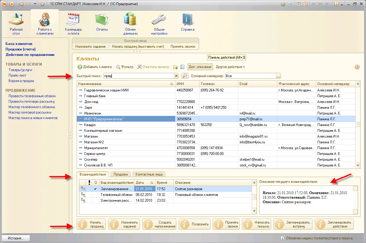 - Управление клиентской базой, хранение подробной характеристики о каждом клиенте и контактном лице, отслеживание динамики изменения состояния отношений с клиентами, возможность быстрого ввода и доступа к информации о клиенте;
