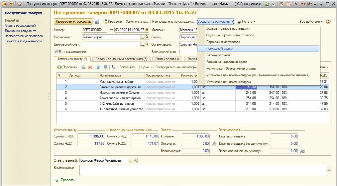 - Оформление прихода товаров от контрагента на склады магазина, в том числе в двухфазовом (ордерном) режиме;
