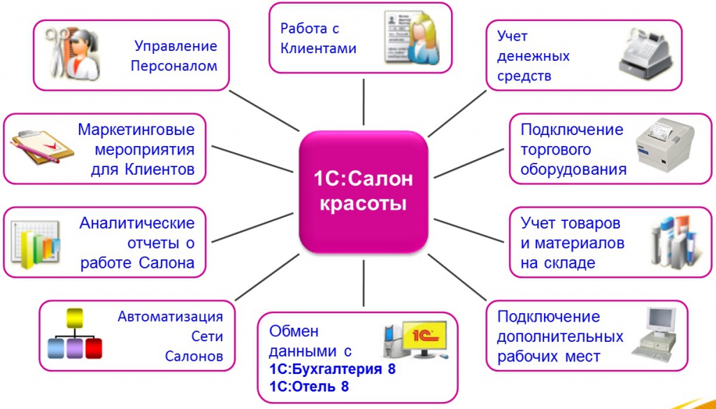 «1С:Салон красоты» — программное решение позволяющее автоматизировать процессы ведения оперативной и финансовой деятельности в парикмахерских, салонах красоты, СПА-центрах. Программный продукт будет полезен для кассиров, администраторов и управленцев. Область применения программы: одиночные и сетевые объекты.